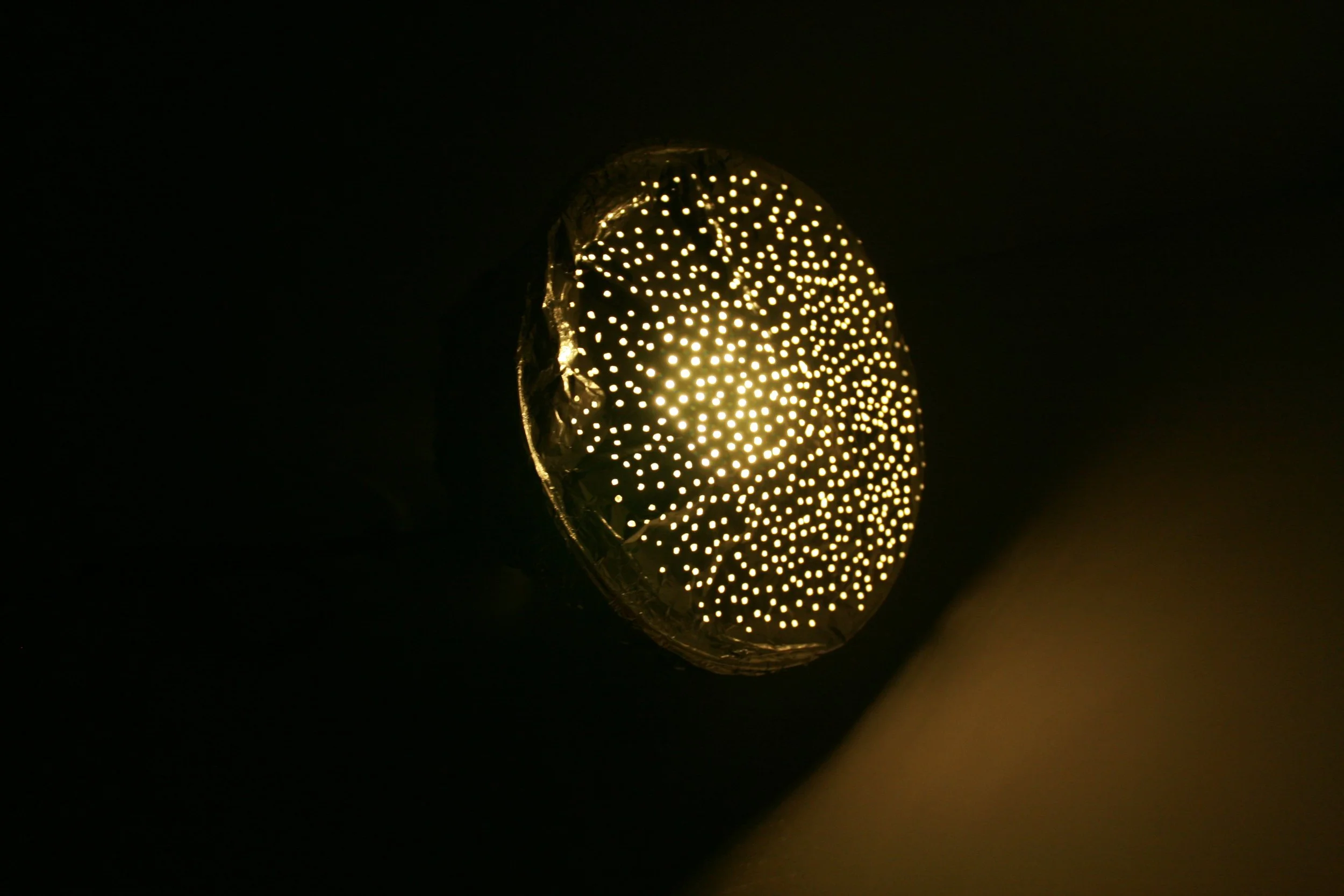 The sculpture is an exploration of being with the body. The perforations were poked by hand to allow light to filter through the already translucent nature of paper mache. The light inside slowly pulsates and synchronizes with the breathe. The project came about after observing light around me at different parts of the day, what is emitted, what is sang.